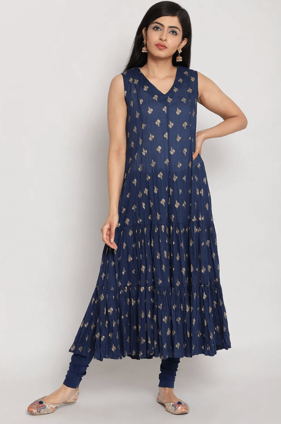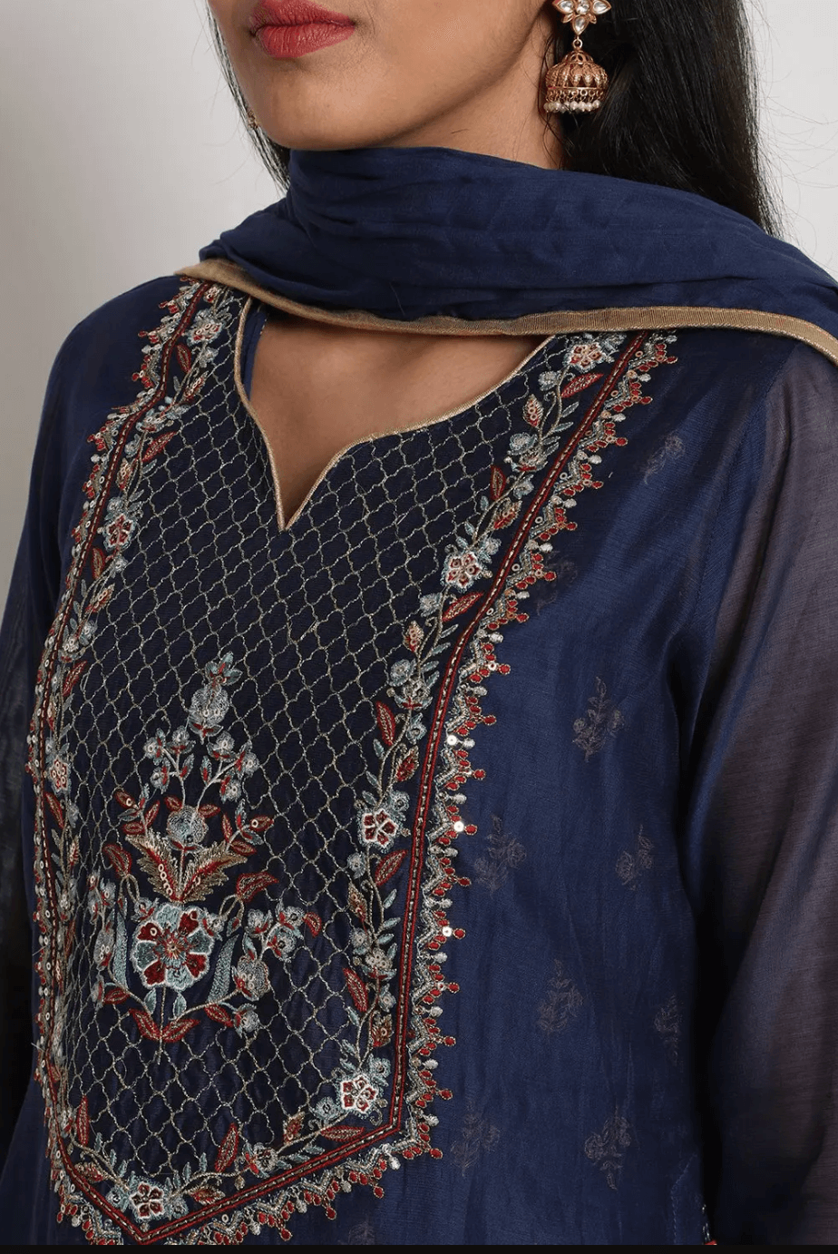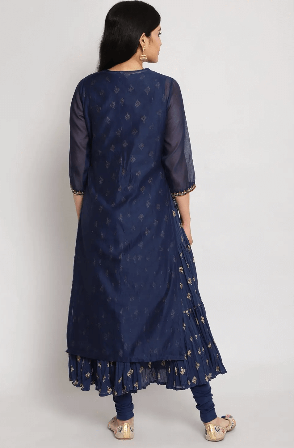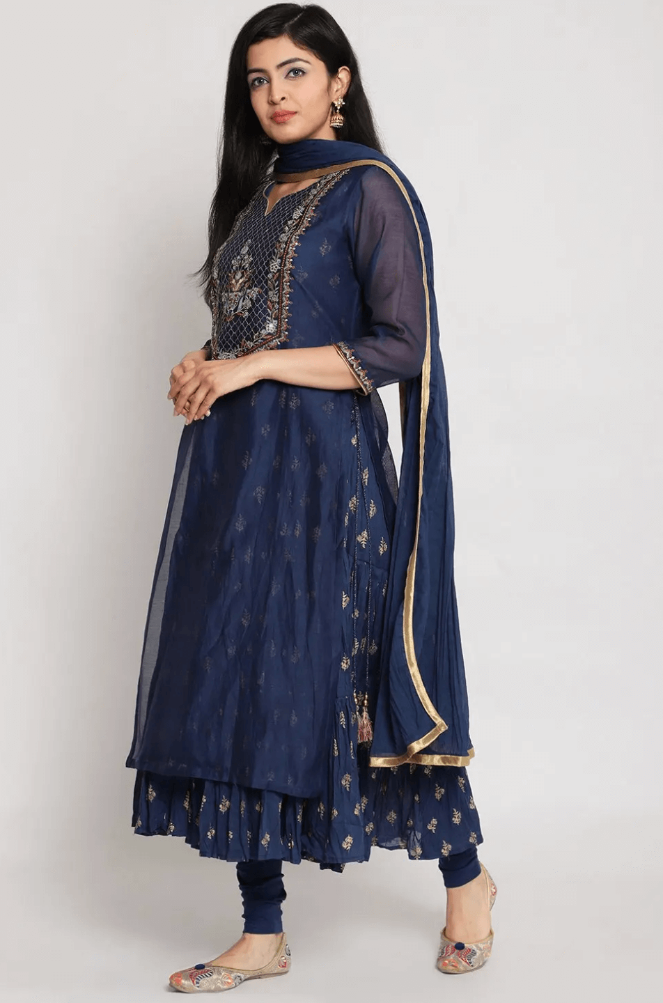 A navy blue suit set with festive perfect detailing. The set combines, straight fit kurta, flared inner, churidar and Dupatta. Kurta comes accentuated with embroidery and sitara work with high slit on either side along with dori tie. Inner comes with metallic print, churidar comes in solid pattern and dupatta features gold lace border.